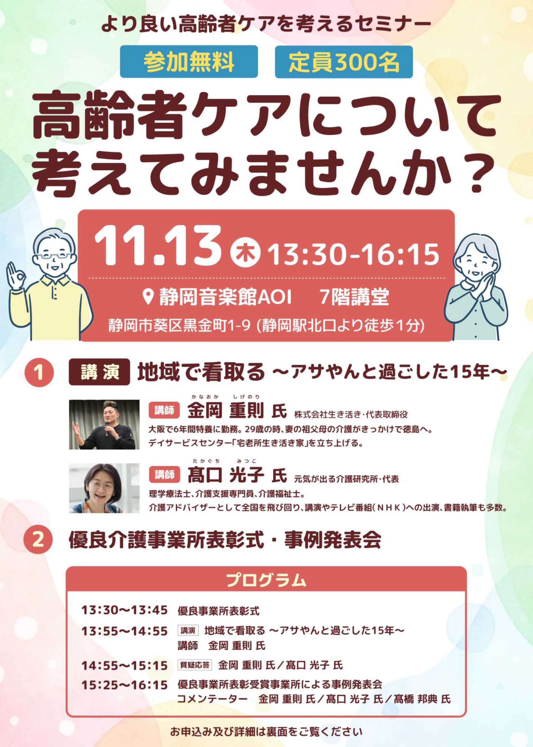 研修参加費!無料! 定員300名高齢者ケアについて考えてみませんか