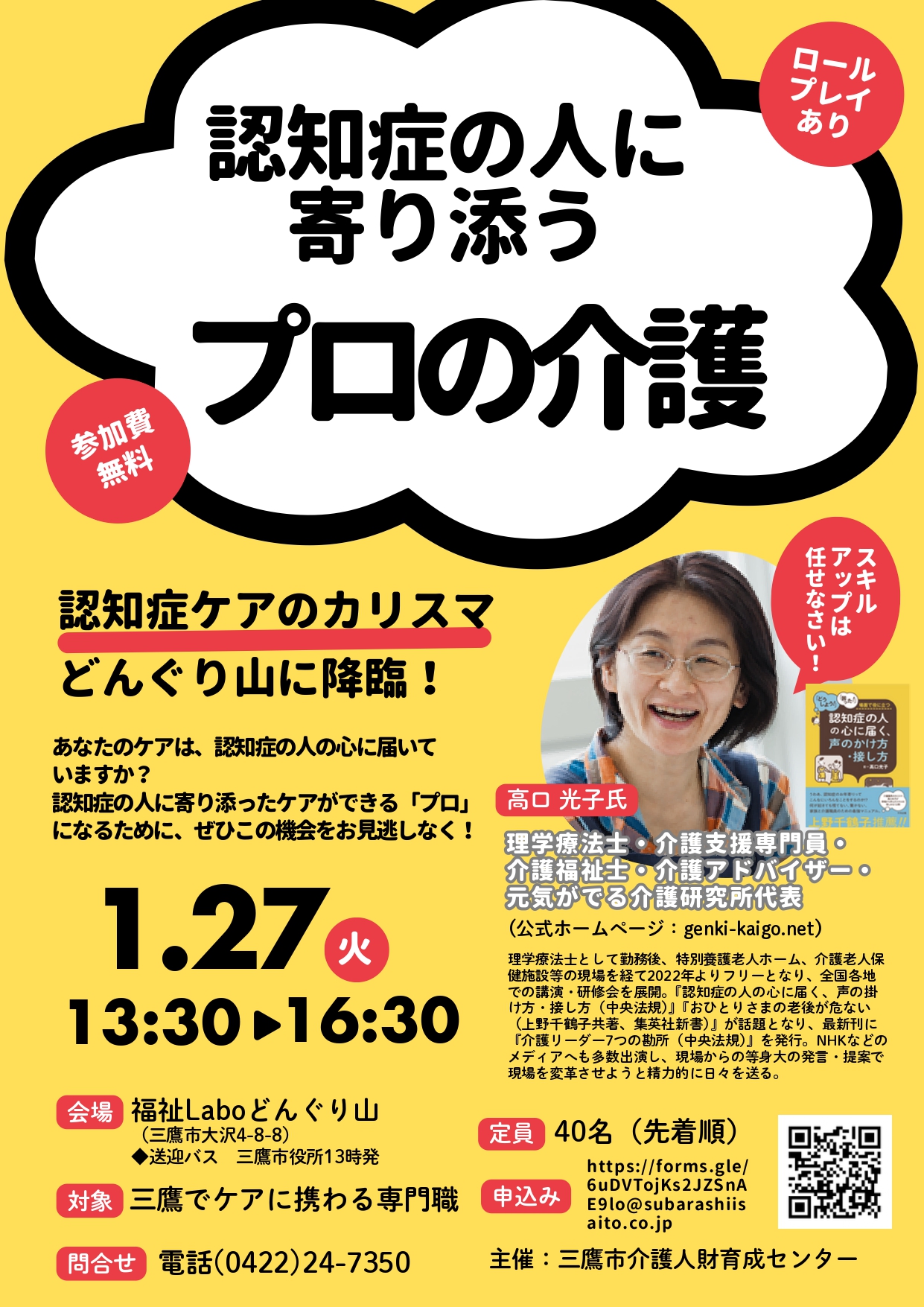 参加費:無料 対象:三鷹でケアに携わる専門職 認知症の人に寄り添う プロの介護