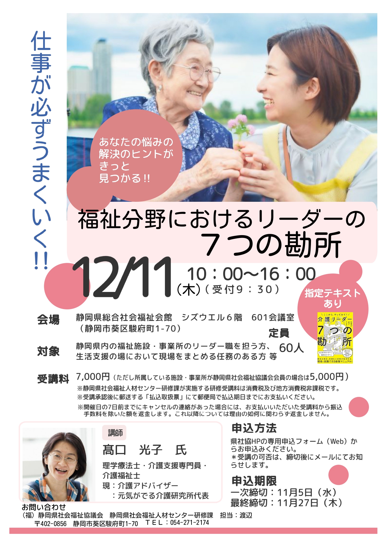 研修参加費7,000円 会員の方は5,000円 申し込み期限 11/5(水) 福祉分野におけるリーダーの7つの勘所