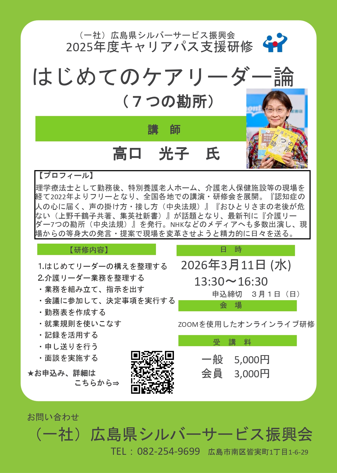 研修参加費 一般5,000円 会員3,000円 はじめてのケアリーダー論(7つの勘所)