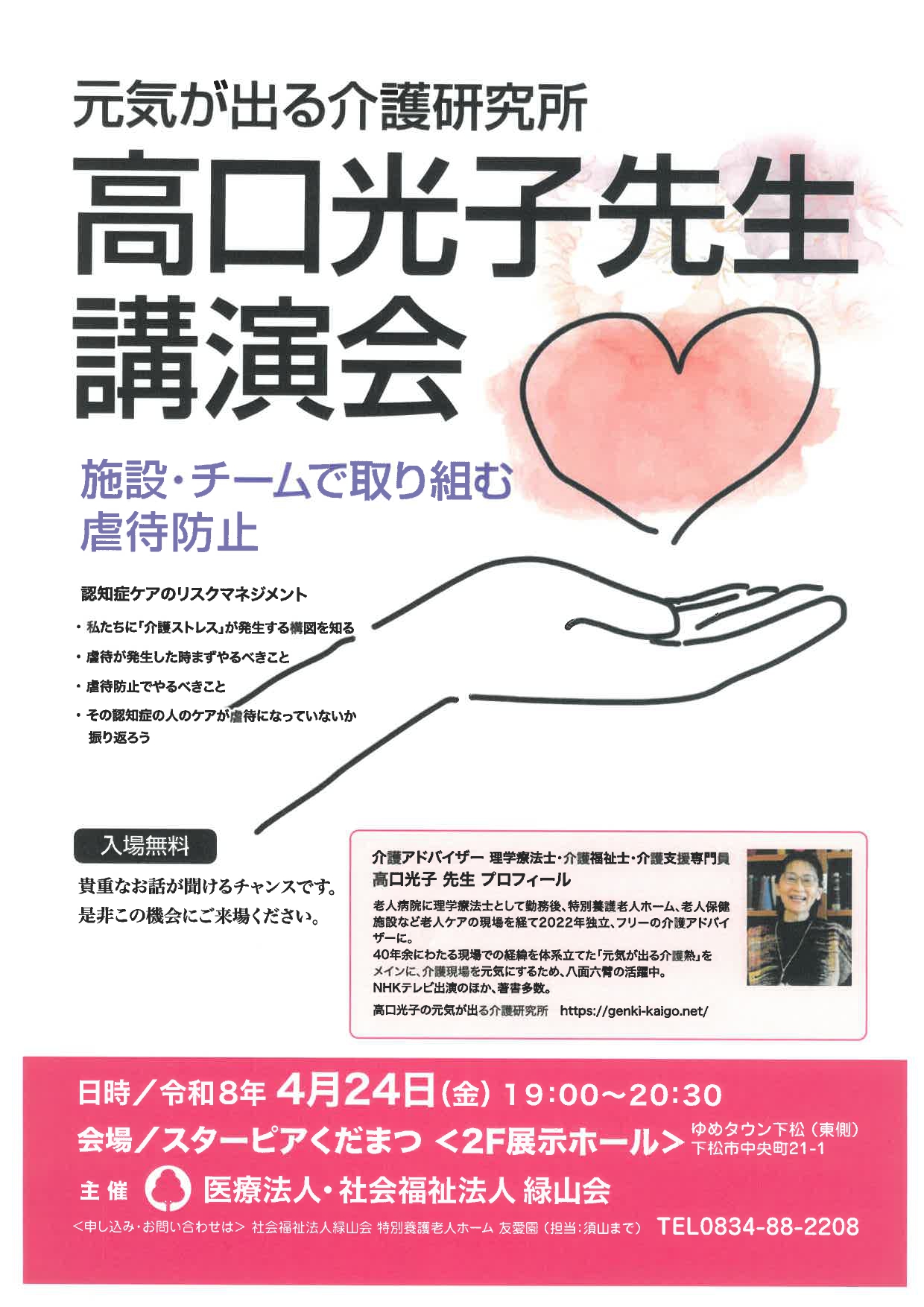 ~認知症ケアのリスクマネジメント~申し込み先メールアドレス:社会福祉法人緑山会 特別養護老人ホーム友愛園 TEL0834-88-2208
